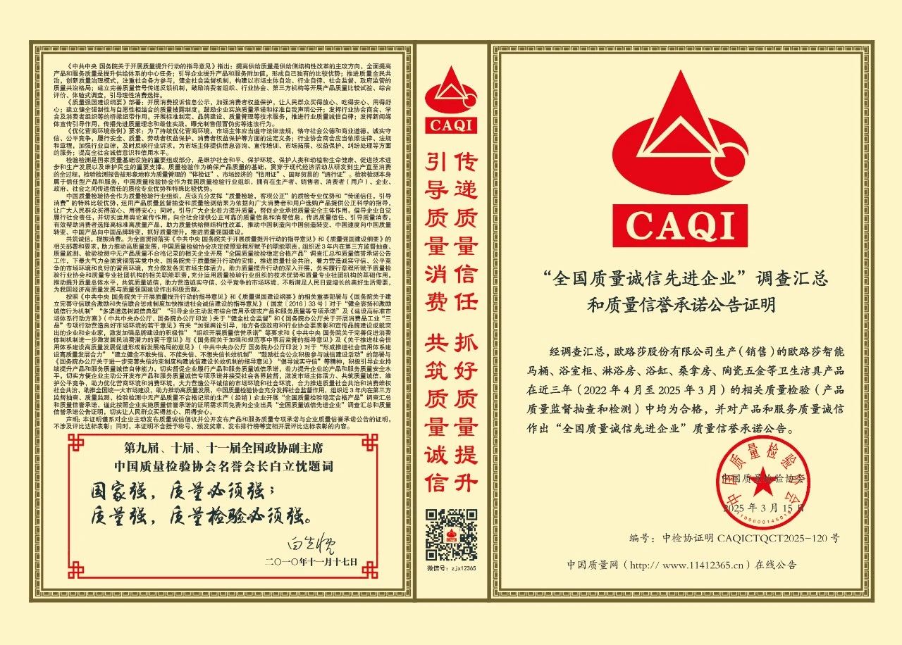 質(zhì)量是企業(yè)的生命,更是對用戶的誠信。歐路莎將帶著社會、行業(yè)、消費者對歐路莎品牌的認可,不斷提高質(zhì)量管理水準,推動產(chǎn)品、服務質(zhì)量和效益穩(wěn)步提升,將健康與智能融入產(chǎn)品創(chuàng)新,發(fā)揮好標桿示范引領(lǐng)作用,推動中國智造高質(zhì)量發(fā)展,打造民族品牌在品質(zhì)時代的新名片!