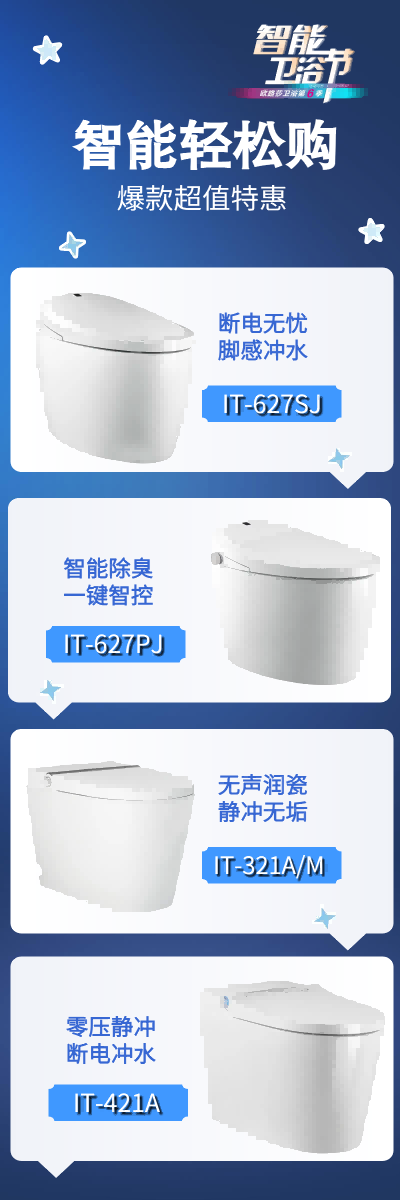 本次活動(dòng)推出的爆款智能馬桶IT-627SJ在原來(lái)IT-627S的基礎(chǔ)上進(jìn)行了升級(jí),不僅功能配置有所大幅度提升,而且價(jià)格更加親民,同步超多智能馬桶、浴室柜、花灑、五金、淋浴房、浴缸、桑拿房等限時(shí)抄底價(jià),讓每一位消費(fèi)者體驗(yàn)智能輕松購(gòu)得“勁爽”,讓客戶們裝得省心,用得放心!