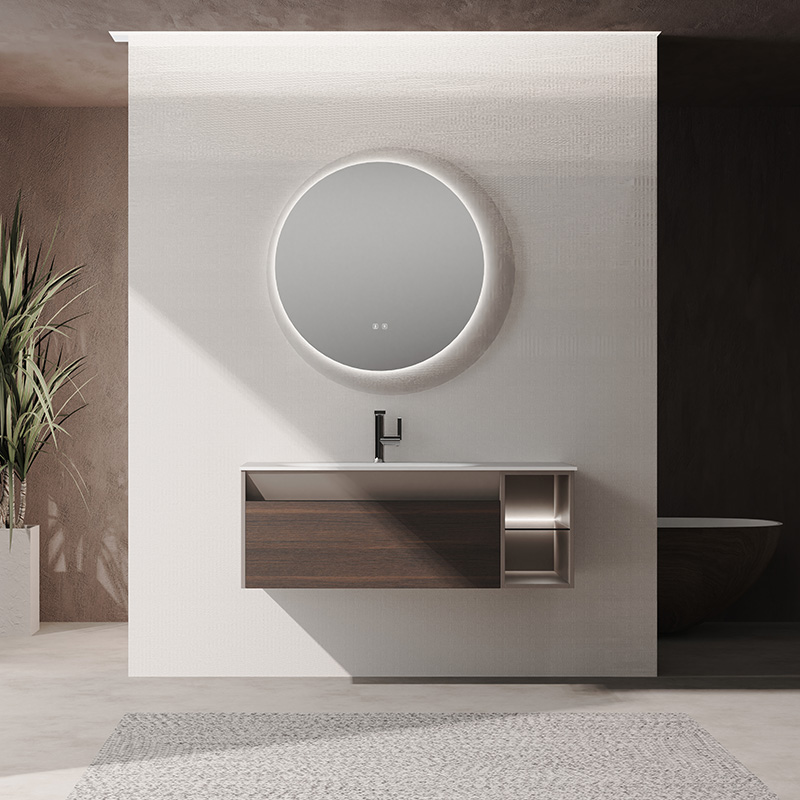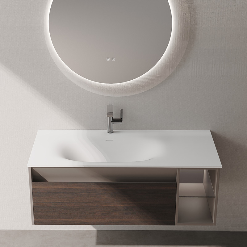 材質(zhì):奇美石一體盆/煙熏橡木/智能圓鏡/置物架可選配/品質(zhì)實(shí)木
