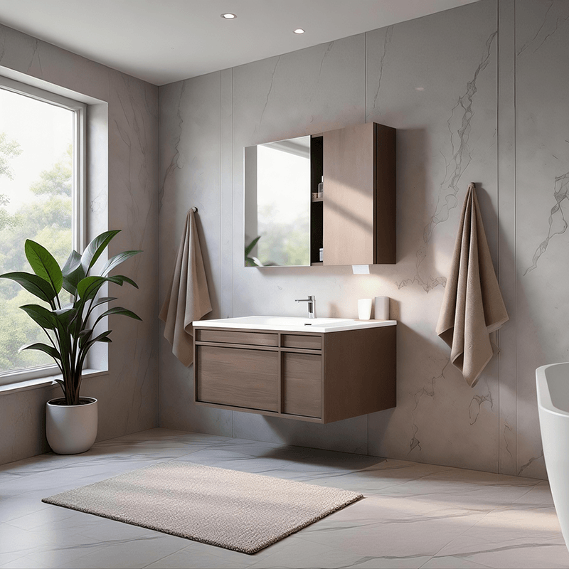 意式胡桃木的溫潤(rùn)紋理,如流云掠過(guò)山崗,在方寸間勾勒出松弛又高級(jí)的浴室美學(xué)